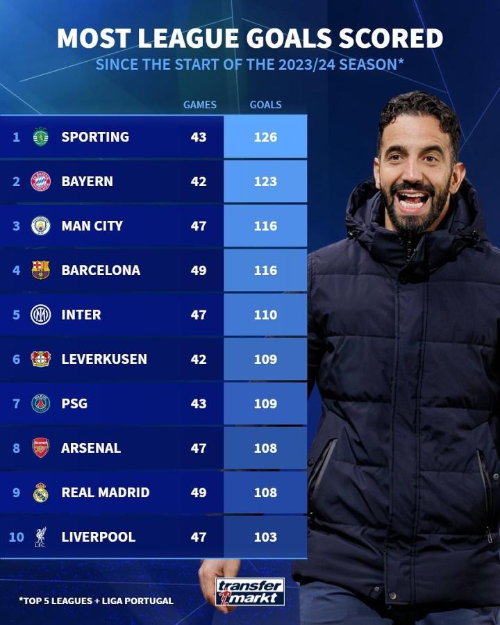 据此前媒体报道称,曼联正与葡萄牙体育就聘请主帅阿莫里姆进行谈判,据统计,自2023-24赛季,葡萄牙体育是五大联赛+葡超联赛进球最多的球队,一共打入126球。
