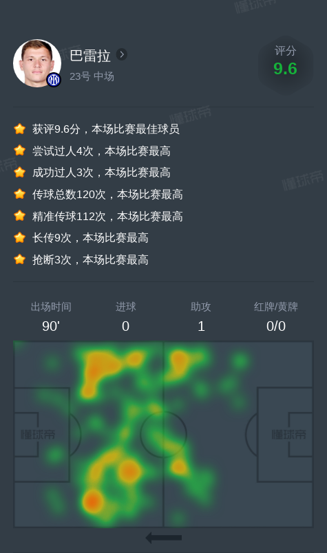 北京时间10月31日恩波利vs国际米兰,巴雷拉1助攻,3次关键传球,3次射门,3次成功过人。