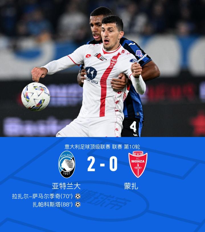 亚特兰大2-0蒙扎迎联赛4连胜,萨马尔季奇、扎帕科斯塔建功