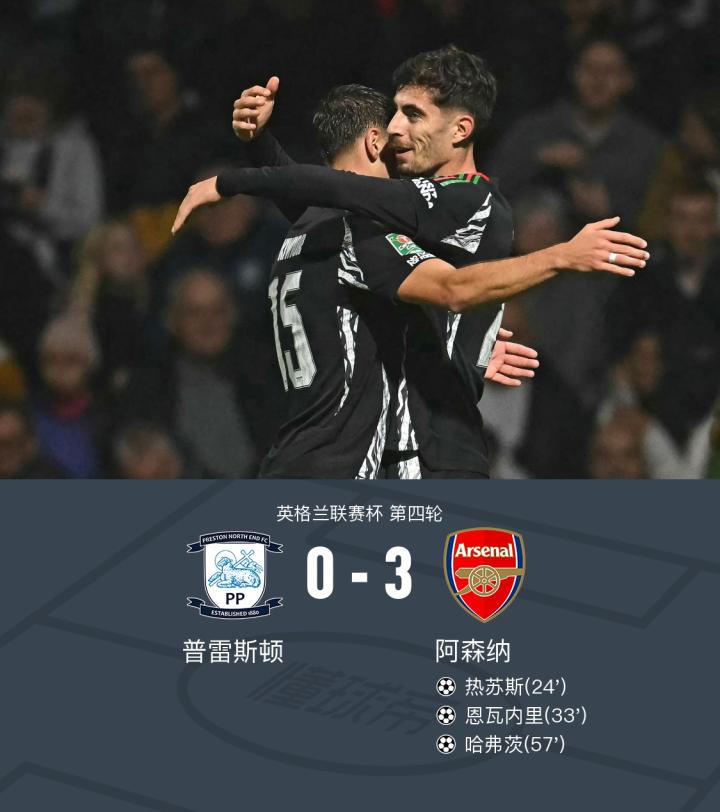 英联杯阿森纳客场3-0普雷斯顿,热苏斯传射,哈弗茨建功