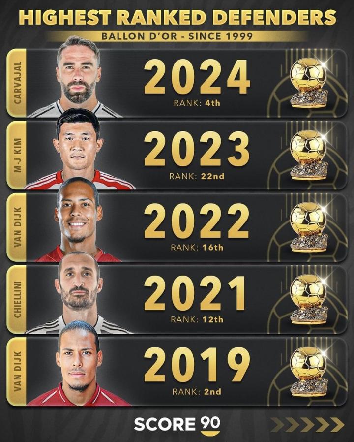 媒体score90统计出了自1999年以来历年金球奖评选名次最高的后卫,2006年的卡纳瓦罗是迄今为止唯一一名赢得过金球奖的后卫球员,2002年的罗伯托-卡洛斯和2019年的范戴克都曾在金球奖的评选中排名第二,保罗-马尔蒂尼在2003年金球奖的评选中曾位列第三,而2024年金球奖的评选卡瓦哈尔则排名第四。