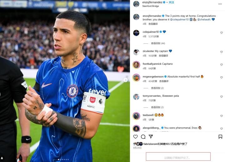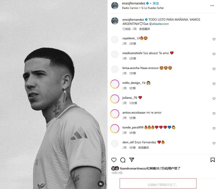 在这则新闻被曝出之后,恩佐就关闭了自己社交媒体的所有评论区,之后,瓦伦蒂娜在社交媒体上发布动态,宣布了两人分手的消息,截至目前,恩佐还没有在社媒上做出任何回应。