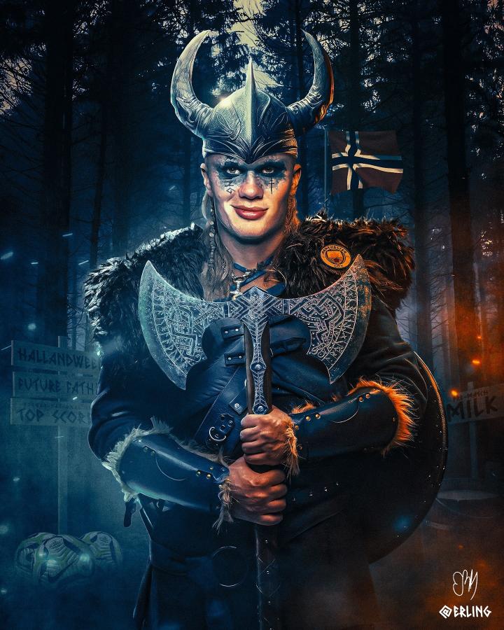 10月31日万圣节,哈兰德在社交媒体晒出一张海报,这位挪威前锋化身维京战士。