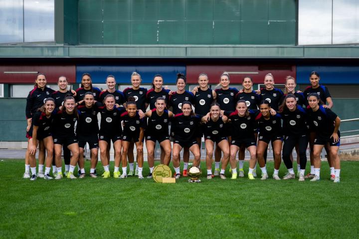 此外,巴塞罗那女足在金球奖颁奖典礼上获得了年度最佳女子俱乐部的荣誉,全队在训练中与奖杯合影留念。