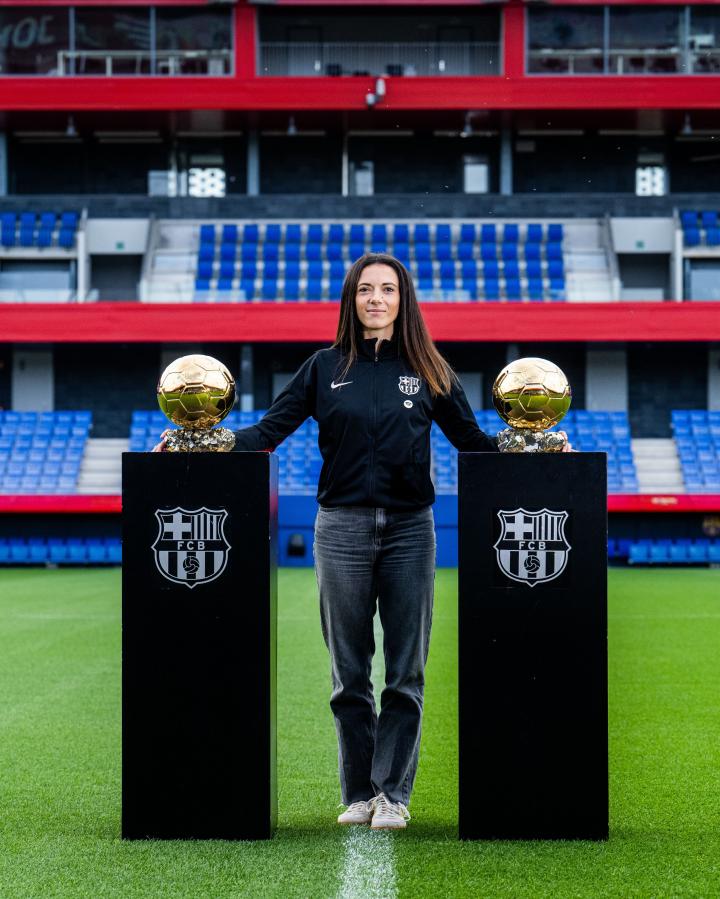 此前获得金球奖的巴塞罗那女足球员邦马蒂回归了训练,巴萨官方晒出了她展示双金球的照片。