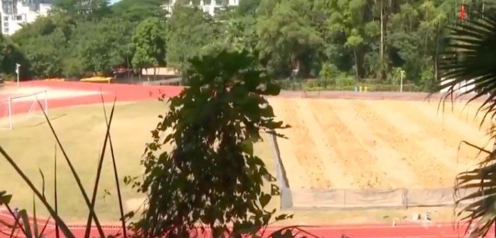 记者来到了广州应元颐和实验学校,目前,整个足球场的草坪已经围垦,种上了一排排的番薯,围栏外则还有学生在进行体育运动,只能围绕跑道进行跑步活动。