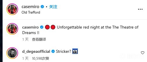 随后,德赫亚在卡塞米罗的动态下评论:“你是前锋吗?👀”