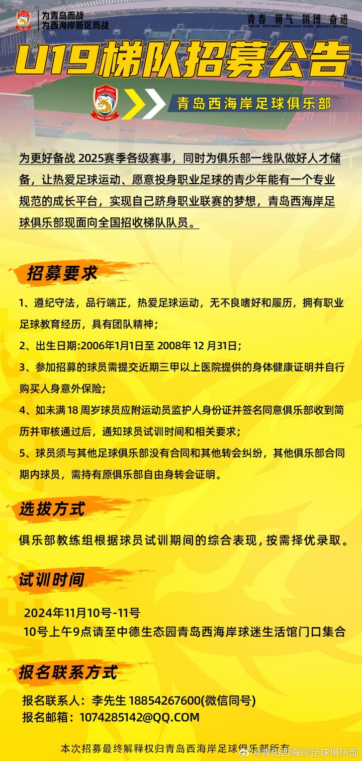 为更好备战2025赛季各级赛事,同时为俱乐部一线队做好人才储备,让热爱足球运动、愿意投身职业足球的青少年能有一个专业规范的成长平台,实现自己跻身职业联赛的梦想,青岛西海岸足球俱乐部现面向全国招收梯队队员。