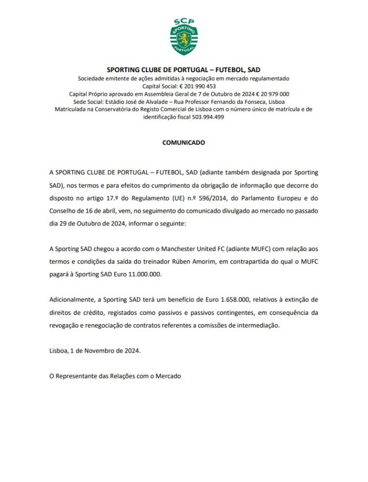葡萄牙体育股份有限公司已与曼联足球俱乐部(以下简称曼联)就主教练阿莫里姆的离任条款和条件达成协议,曼联将为此支付葡萄牙体育1100万欧元。