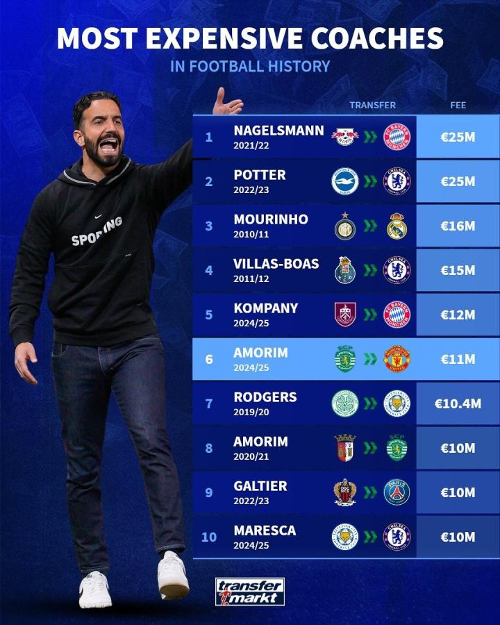 北京时间11月1日,曼联官方宣布阿莫里姆将在11月11日执教球队,根据葡萄牙体育官方公布的信息,这笔交易的费用为1100万欧元,随后,德国转会市场列出了转会费最高的主帅前十。