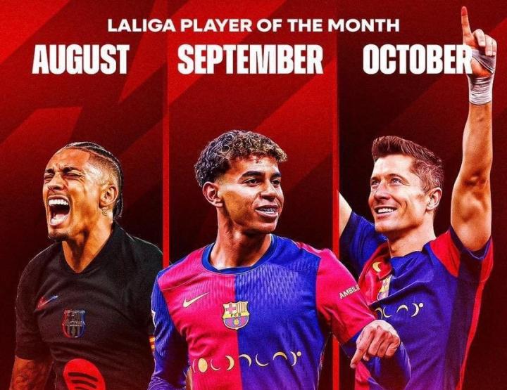 本赛季西甲前三个月,巴萨球员包揽了西甲月度最佳球员,拉菲尼亚、亚马尔和莱万先后获得8月、9月和10月最佳球员。