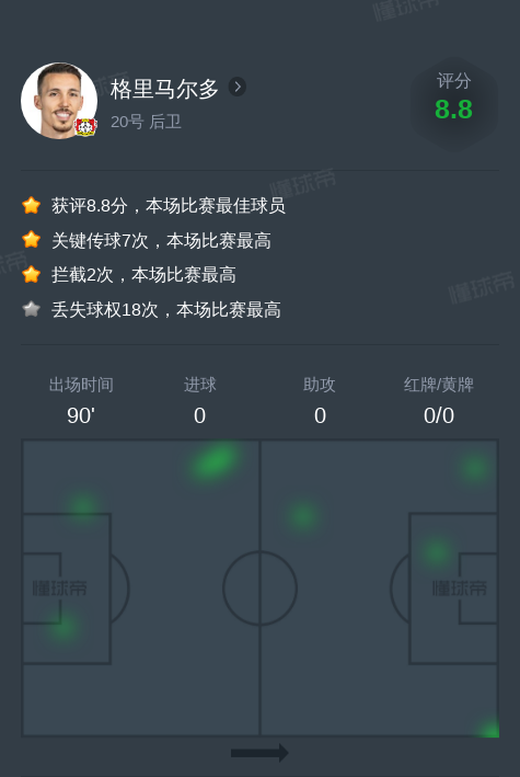 北京时间11月2日勒沃库森vs斯图加特,格里马尔多7次关键传球,2次射门,4次成功过人。