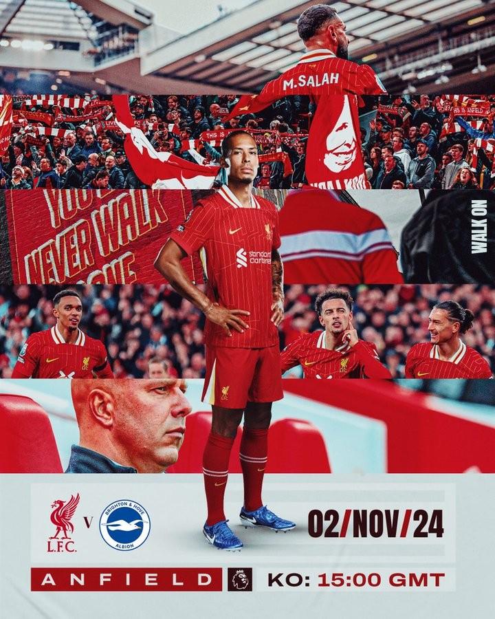 北京时间11月2日晚23点,英超联赛第10轮,利物浦将在主场迎战布莱顿。赛前,利物浦官方发布了本场比赛的赛前海报。