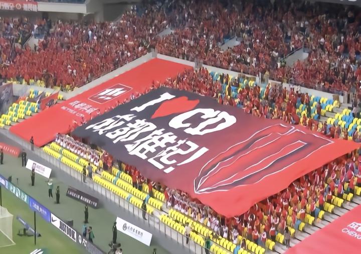 此外,在公益南看台,同样举起了交相辉映的TIFO,上面写着“I❤️CD,成都雄起!”。