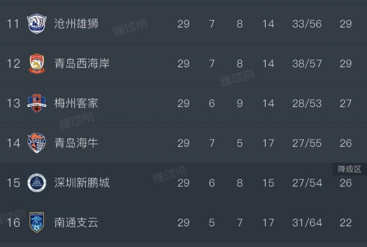 37’青岛海牛1-0领先沧州雄狮,新鹏城因净胜球劣势降级。