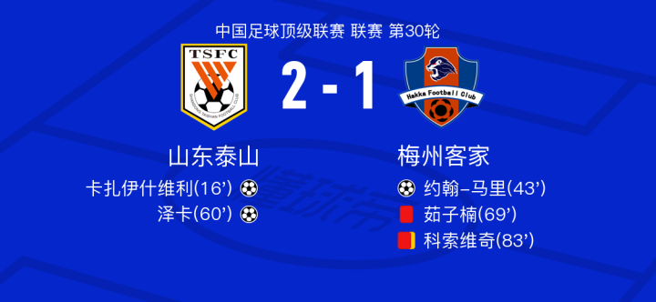 北京时间11月2日山东泰山vs梅州客家,克雷桑得到全场最高的8.4分,茹子楠得到全场最低的6.1分