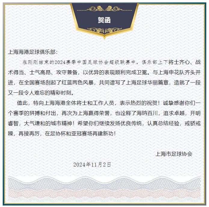 在今天下午进行的中超第30轮比赛中,上海海港5-0大胜天津津门虎,赢得本赛季中超冠军,随后,上海足协发布贺函,祝贺上海海港夺冠。