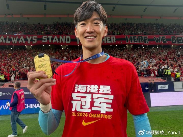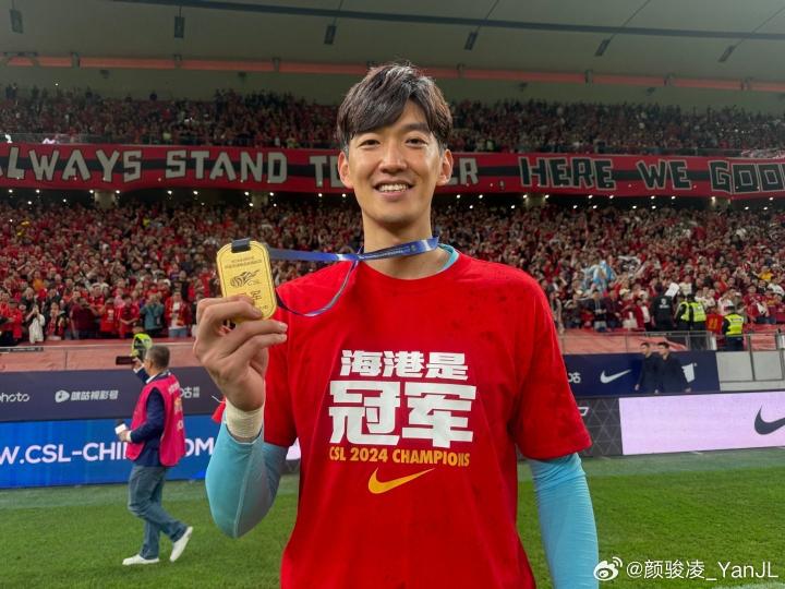 海港门将颜骏凌在微博晒出他身穿夺冠特制T恤、手拿冠军奖牌的照片,并配上“🏆🌟🌟🌟”表情。