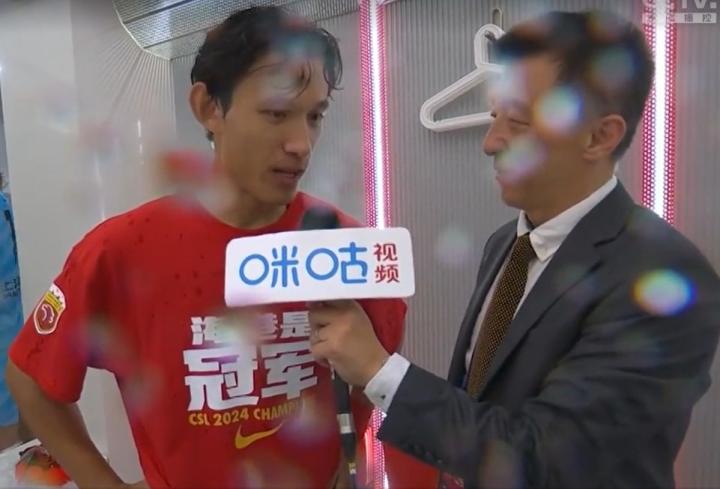 在夺得本赛季中超冠军后,王燊超在更衣室内接受了著名足球解说员刘越的采访。