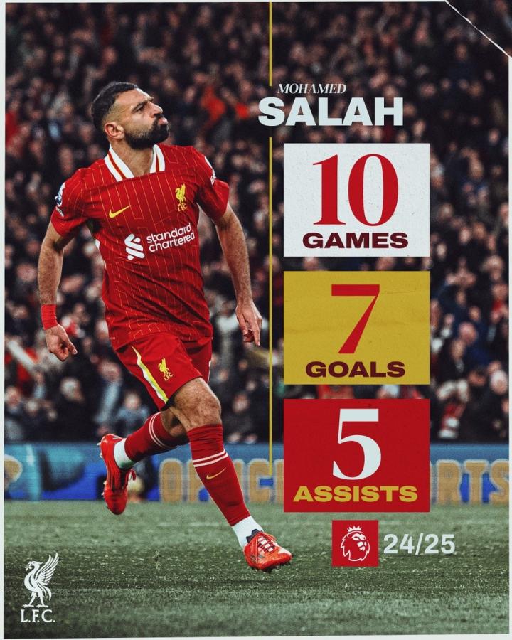 本赛季英超至今,萨拉赫出场10次已奉献7球5助。