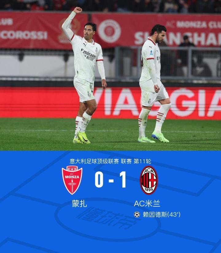 米兰1-0蒙扎,赖因德斯一击制胜,莱奥一条龙突破失单刀