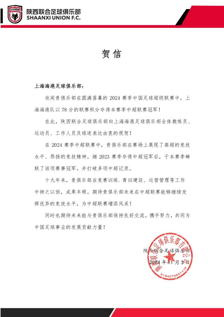 11月2日下午,中超第30轮,上海海港在主场5-0大胜天津津门虎,夺得本赛季中超冠军。此前,陕西联合足球俱乐部官方发布贺信,向上海海港表示祝贺。