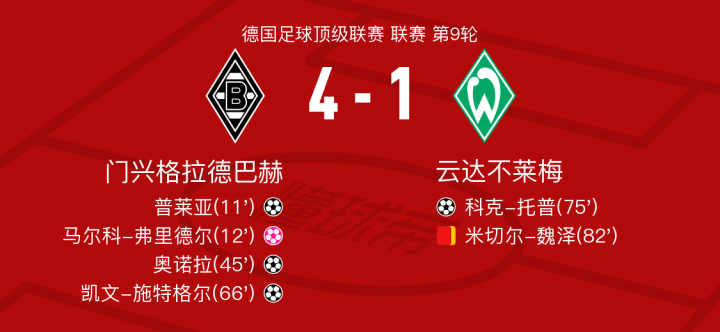 北京时间11月4日门兴格拉德巴赫vs云达不莱梅,克莱因丁斯特得到全场最高的8.0分,泽特尔得到全场最低的5.8分