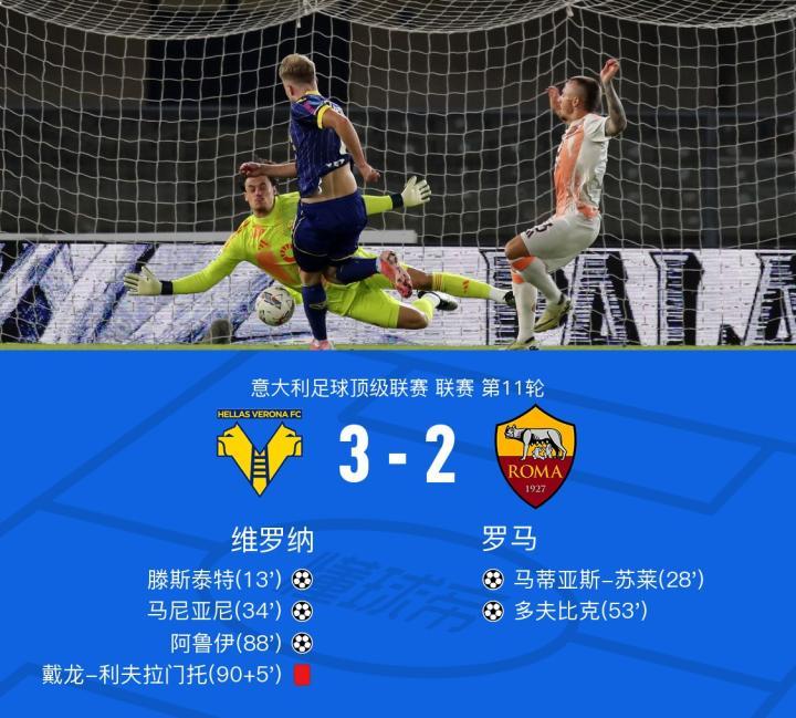 罗马2-3遭维罗纳绝杀,苏莱迎罗马生涯首球,多夫比克建功