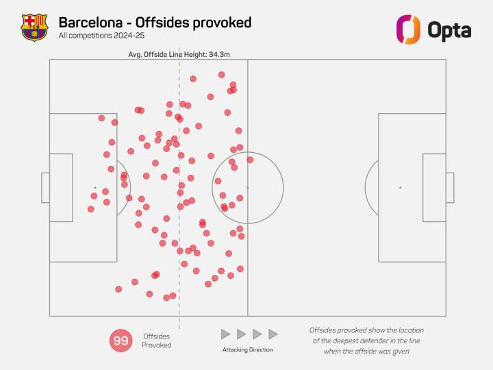 本场比赛结束后,巴萨在本赛季各项赛事中已经造成了对手总计99次越位,他们也是本赛季欧洲五大联赛球队中造成对手越位次数最多的球队。