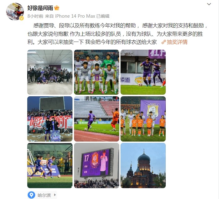 闫雨在微博里写道:“感谢贾导、段导以及所有教练今年对我的帮助, 感谢大家对我的支持和鼓励,也跟大家说句抱歉,作为上场比较多的队员,没有为球队、为大家带来更多的胜利。大家可以来抽奖一下,我会把今年的所有球衣送给大家。”注:抽奖链接在闫雨个人微博账号。