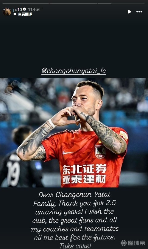祖伊在社交媒体里写道:“亲爱的长春亚泰大家庭,感谢这两年半的美妙经历。我祝愿亚泰俱乐部、非常出色的球迷朋友们、共事的教练员们以及所有队友们未来一切顺利。保重!”