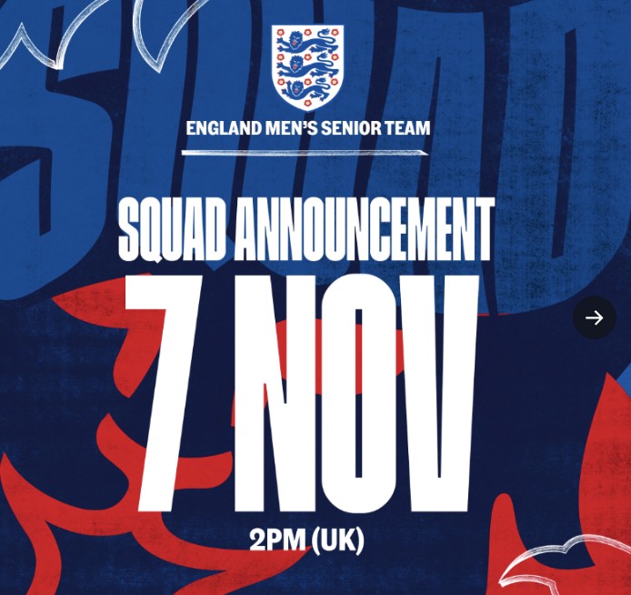 北京时间11月4日晚,英格兰队官方宣布,本期球队大名单将于当地时间本周四(11月7日)正式公布。