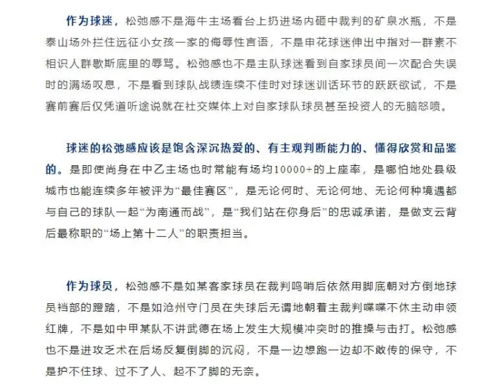 投资人对“小作文”的偏爱,也传导到了俱乐部一级。今年5月,南通支云俱乐部官方账号转载了一篇《享受足球,需要多一点松弛感》的文章,引起舆论哗然。此文单方面点名了海牛、泰山、申花等队部分球迷的不理智行为,内涵了在球队战绩不佳时向球员喊话训话的国安球迷。不仅如此,在结束了对多支球队的无差别扫射后,文章还给自身抬咖,狠狠地吹了一波自家球迷和球员,堪称中超版的“慈禧太后向多国宣战”。