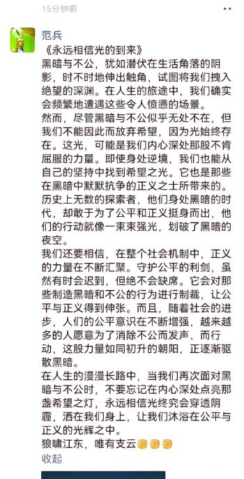 南通支云升入中超后,范兵的第一篇“小作文”,诞生于2023年5月。第5轮南通支云客场0-1不敌长春亚泰比赛尾声,亚泰队员在本方禁区内疑似手球,但主裁判并未判罚点球,也并未查看VAR。赛后,范兵在朋友圈怒批“裁判业务水平低下,VAR成了摆设”,被足协罚款一万元,并禁入比赛场地一次。