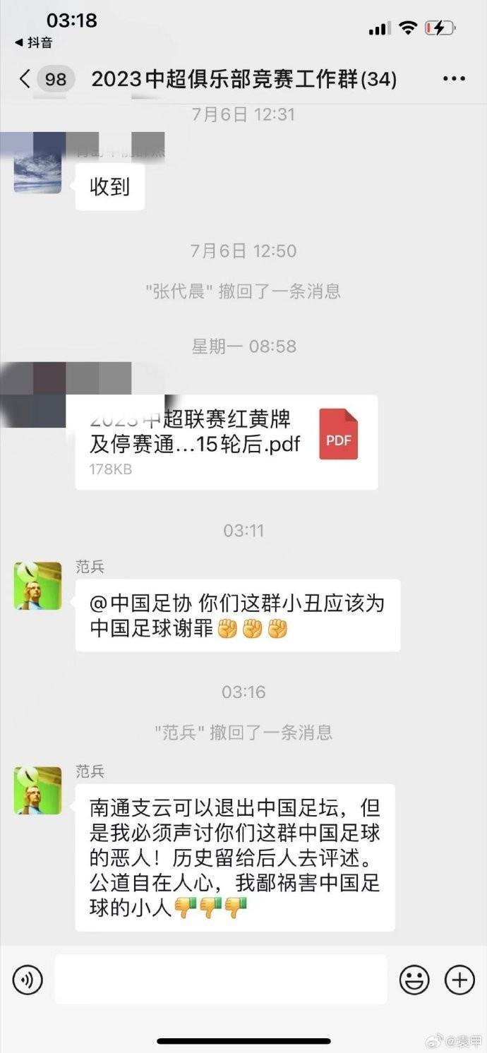 第16轮南通支云1-1战平大连人的比赛中,主裁判与VAR的误判,导致桂宏的进球被判无效。赛后,范兵在中超联赛工作群组中怒喷足协,甚至扬言“要退出中超”,大有“舍得一身剐,要将足协拉下马”的慷慨激昂: