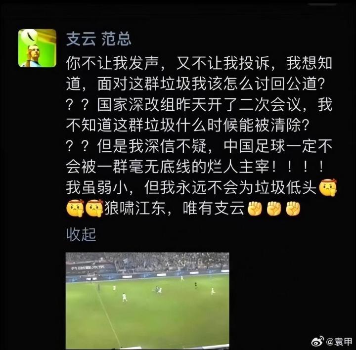 仿佛在足协领导面前发泄还不过瘾,随后范兵又将遭受不公正判罚的怒火倾泻到了朋友圈。一句“我虽弱小,但我永远不会为垃圾低头”,一时间让他收获了“斗士”的称号。平心而论,面对不公正判罚,范兵作为俱乐部投资人展现出捍卫自身利益的姿态,是值得肯定的。但随着类似事件的一再发生,“斗士”却渐渐褪去了当初的本色,变成了哗众取宠般的“小仙女”。