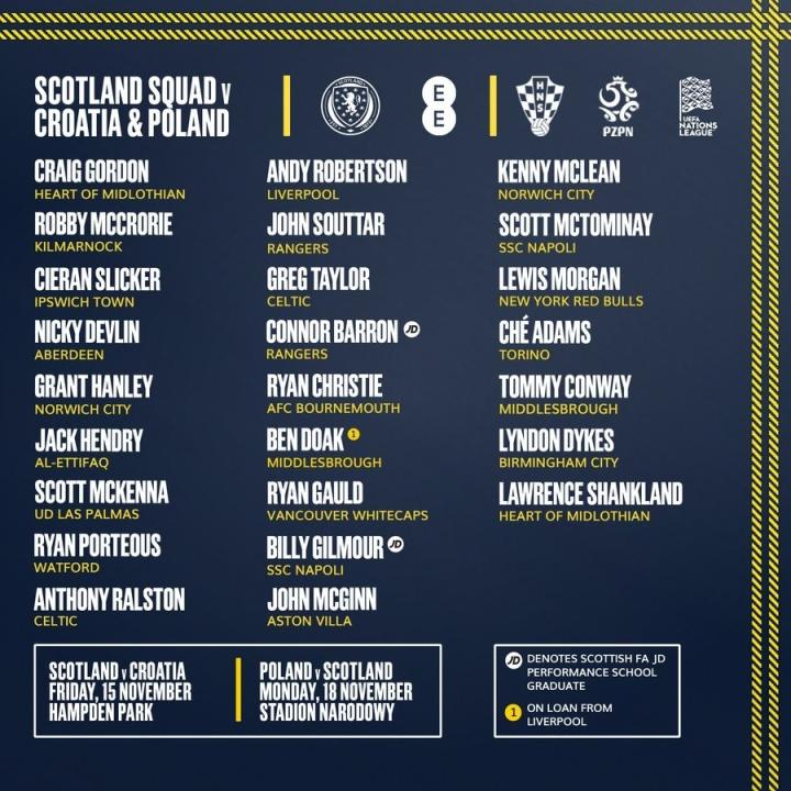 苏格兰国家队公布了其11月份欧国联比赛大名单,罗伯逊、麦克托米奈、麦金和吉尔摩等人悉数在列。