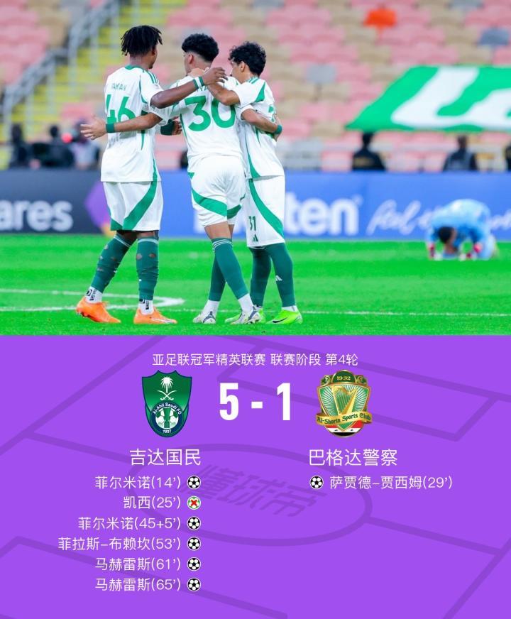 亚冠吉达国民5-1巴格达警察,菲尔米诺2射1传,马赫雷斯双响