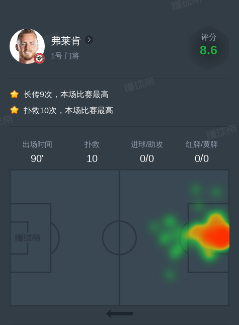 北京时间11月5日富勒姆vs布伦特福德,弗莱肯10扑救。