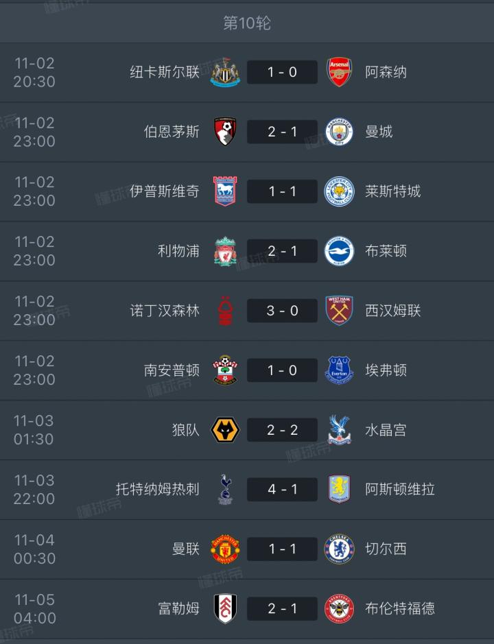 本轮英超10场比赛中,客场作战的球队无一取胜,战绩为3平7负,这是本赛季英超首次出现单轮没有客场球队赢球的情况。