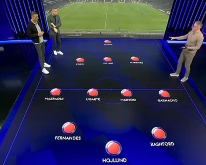 卡拉格预测的首发阵容中左翼卫选了加纳乔。后场选择了由德利赫特、马丁内斯和约罗组成的中后卫线,中场由乌加特和科比-梅努组成,并将马兹拉维放在右翼卫位置。另外,前场则是选了B费、霍伊伦和拉什福德。