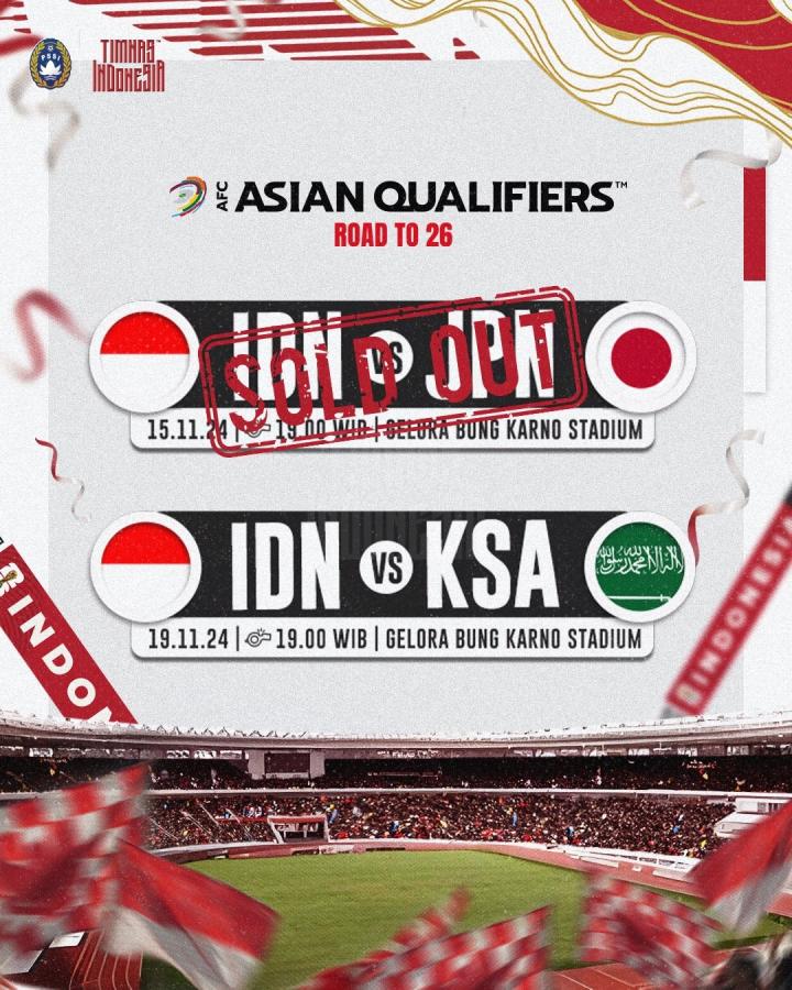 印度尼西亚足协官方消息,11月世预赛印尼对阵日本的门票已经售罄。