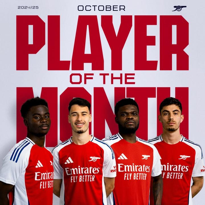 阿森纳公布了俱乐部10月份最佳球员的四位候选者,萨卡、马丁内利、托马斯-帕尔特伊以及哈弗茨入围。