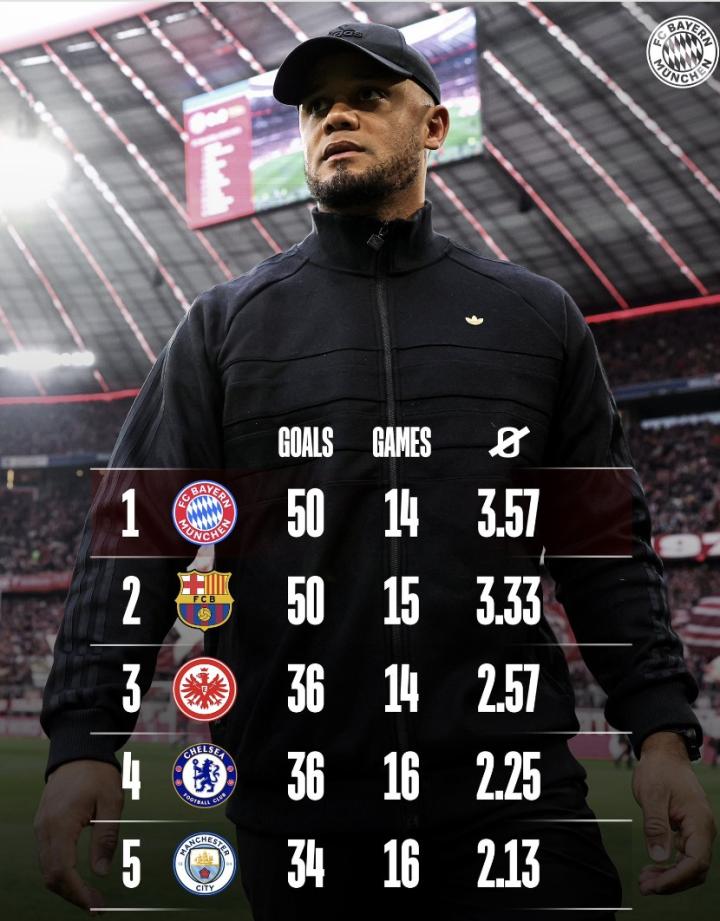 北京时间11月5日,拜仁官方晒出了本赛季五大联赛球队的进球数排行榜。其中,拜仁、巴萨进50球居首。拜仁场均进球3.57球,位列第一。