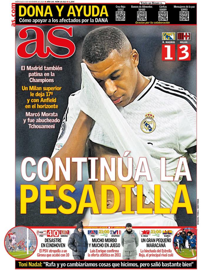 《阿斯报》以姆巴佩的失望形象作为封面,并配文写道:“噩梦还在持续。”