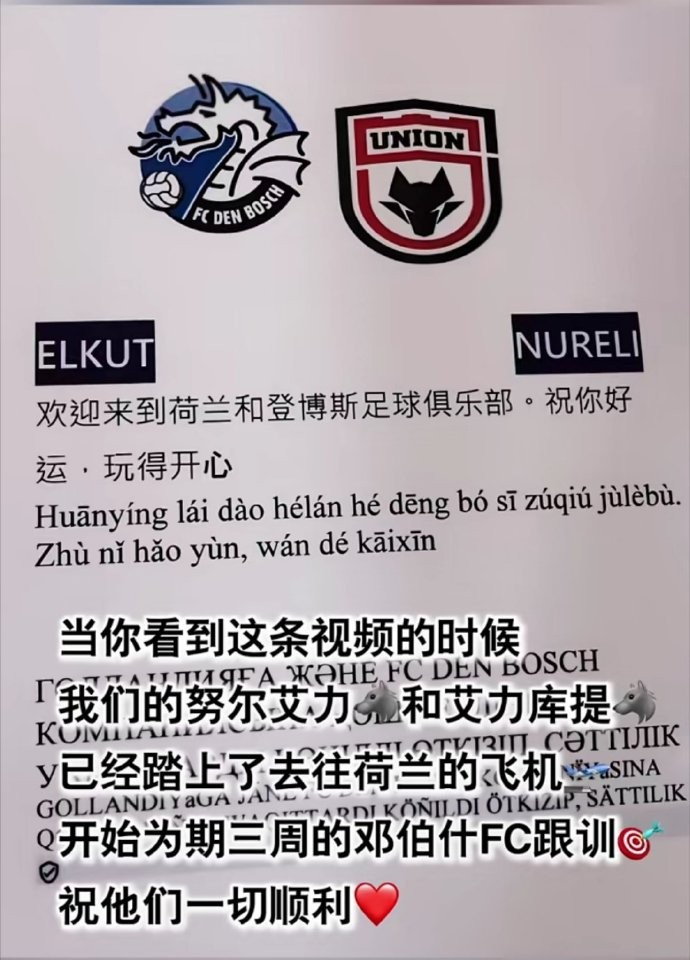 陕西联合俱乐部写道:“当你看到这条视频的时候,我们的努尔艾力和艾力库提已经踏上了去往荷兰的飞机,开始为期三周的邓伯什FC跟训。祝他们一切顺利。”