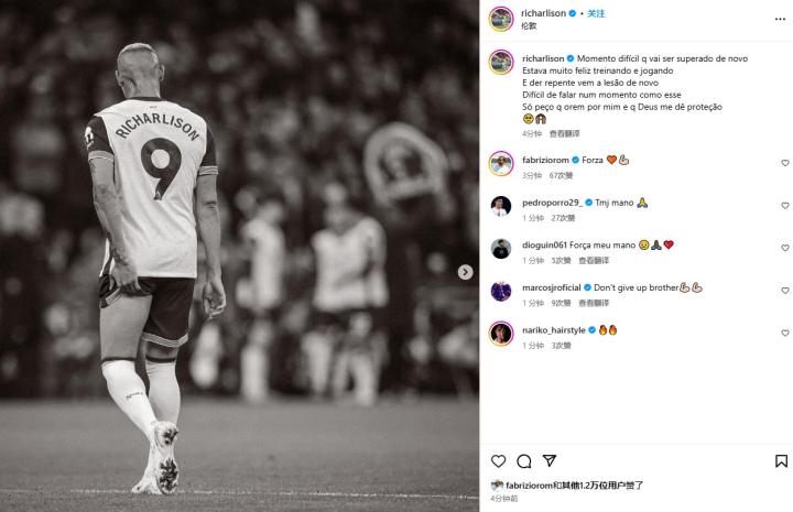里沙利松写道:“这又是一个艰难的时刻,我很高兴自己努力训练和比赛,但现在我又受伤了,很难表达我此刻的感受,只能为自己祈祷......我希望上帝能保佑我。”