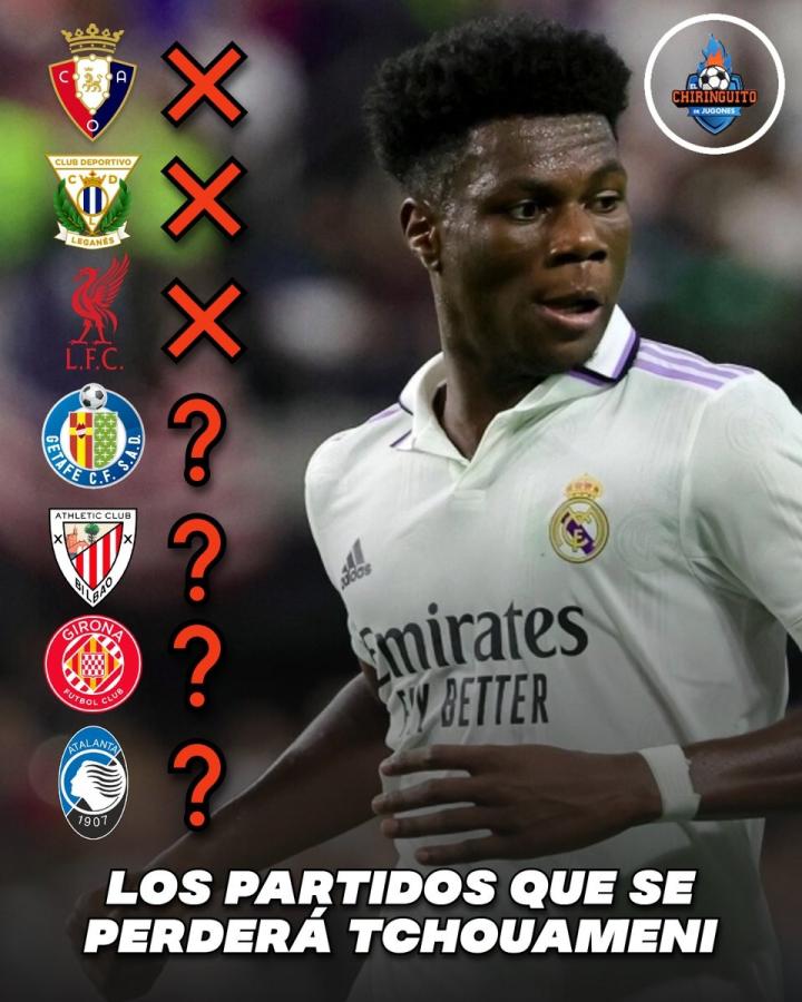 西班牙六台报道称,楚阿梅尼将缺席皇马接下来三场比赛(vs奥萨苏纳、vs莱加内斯、vs利物浦)。