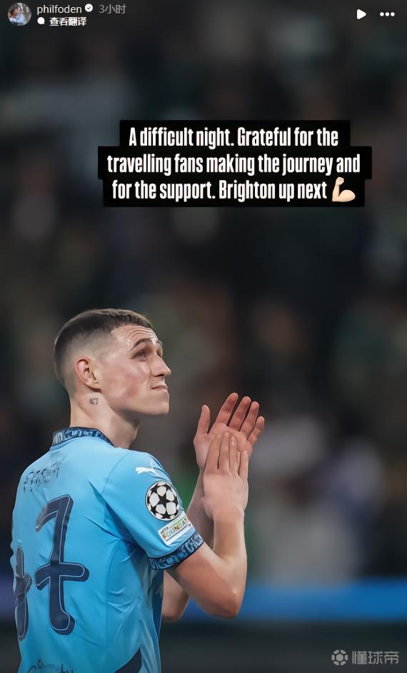 福登在社交媒体上晒出了自己的比赛照,并配文:“困难的一晚,很感谢随队远征的球迷以及你们的支持,为下一场对阵布莱顿的比赛做准备💪”.。