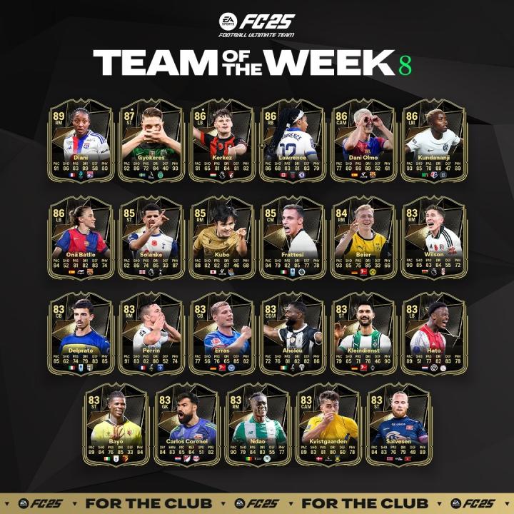 FC25公布了本赛季第八周的周黑卡,哲凯赖什、科尔克兹、奥尔莫、索兰克、久保建英、弗拉泰西、拜尔、哈里-威尔逊、哈托入选。